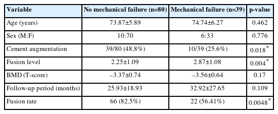 To identify factors associated with mechanical failure, a multivariate logistic regression model was applied. As summarized in Table 4, cement augmentation was found to significantly reduce the risk of mechanical failure (OR 0.279, p=0.006). In contrast, higher fusion levels were associated with a greater risk of mechanical failure (p=0.002), suggesting that more extensive surgical interventions may require additional stabilization measures such as cement augmentation.