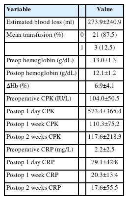 The mean estimated blood loss was 273.9±240.9 mL. Blood transfusion was not required in 87.5% of patients, while 12.5% required a single-unit transfusion. The mean hemoglobin level decreased from 13.0±1.3 g/dL preoperatively to 12.1±1.2 g/dL postoperatively, corresponding to a mean reduction of 6.9±4.1%. Serum creatine phosphokinase (CPK) levels increased from 104.0±50.5 IU/L preoperatively to 573.4±365.4 IU/L on postoperative day 1, and subsequently decreased to near baseline levels at 1 and 2 weeks postoperatively. C-reactive protein (CRP) levels showed a similar transient postoperative elevation, peaking at 79.1±42.8 mg/L on postoperative day 1, followed by gradual normalization (Table 4).