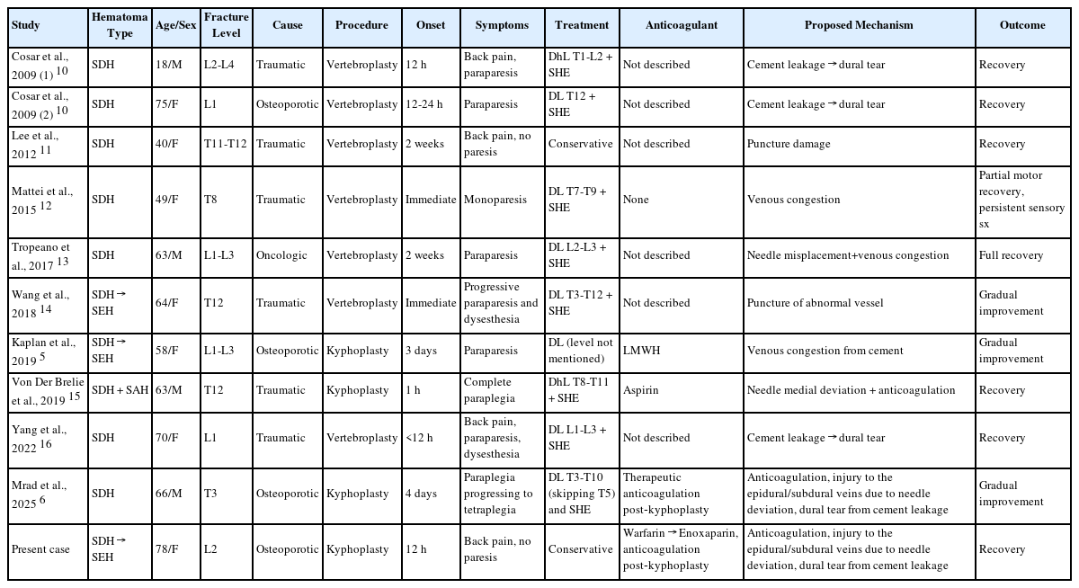 By contrast, Lee et al.11) presented a unique case of delayed SDH following vertebroplasty that was successfully managed with corticosteroids alone, suggesting that conservative treatment may be feasible in select cases with mild or non-progressive symptoms.