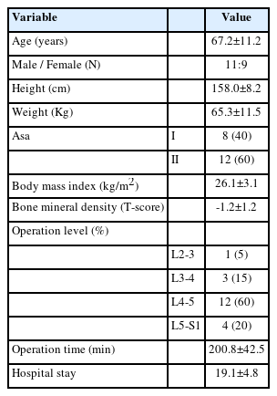 A total of 20 patients were included in this case series. The mean age was 67.2±11.2 years, with 11 male and 9 female patients. The mean body mass index was 26.1±3.1 kg/m², and the mean bone mineral density T-score was −1.2±1.2. According to the American Society of Anesthesiologists (ASA) classification, 8 patients (40%) were classified as ASA I and 12 patients (60%) as ASA II. The most commonly treated level was L4–5 (60%), followed by L5–S1 (20%), L3–4 (15%), and L2–3 (5%). The mean operative time was 200.8±42.5 minutes, and the mean length of hospital stay was 19.1±4.8 days (Table 1).