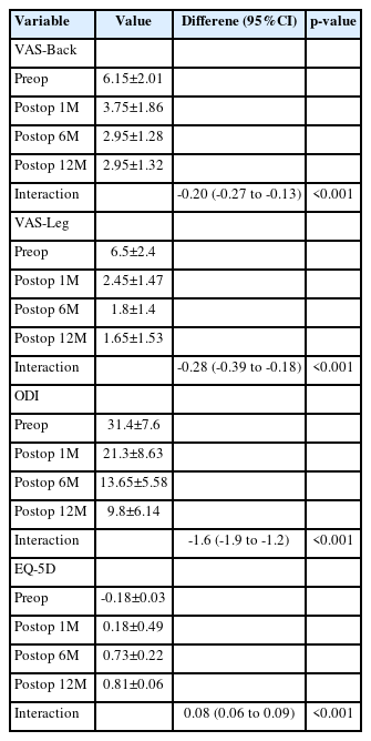 Clinical outcomes were evaluated using the visual analogue scale (VAS) for back and leg pain, the Oswestry Disability Index (ODI), and the EuroQol-5D (EQ-5D). Assessments were performed preoperatively and at 1, 6, and 12 months postoperatively.