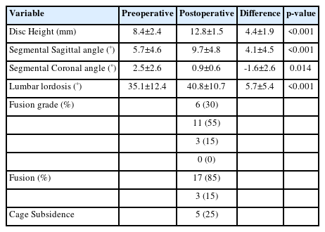 Mean disc height increased from 8.4±2.4 mm preoperatively to 12.8±1.5 mm postoperatively, with a mean increase of 4.4±1.9 mm (p<0.001). Segmental sagittal angle improved from 5.7±4.6° to 9.7±4.8°, representing a mean increase of 4.1±4.5° (p<0.001). Segmental coronal angle decreased from 2.5±2.6° to 0.9±0.6°, indicating improved coronal alignment (p=0.014). Overall lumbar lordosis increased significantly from 35.1±12.4° to 40.8±10.7° (p<0.001). Radiographic fusion was achieved in 17 patients (85%) at the final followup. Cage subsidence was observed in 5 patients (25%), none of whom required revision surgery (Table 3).