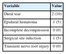 Surgical complications such as dural tear, epidural hematoma, surgical site infection, incomplete decompression, and transient nerve root injury were recorded throughout the follow-up period.